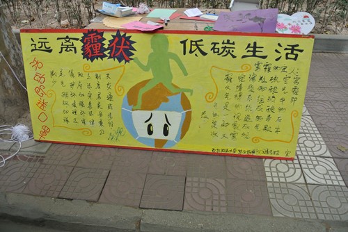 2014年11月12日中午13时,职业技术公司团委员工会生活部,在3号教学楼前开展以“防治雾霾 低碳生活”为主题的环保宣传活动。